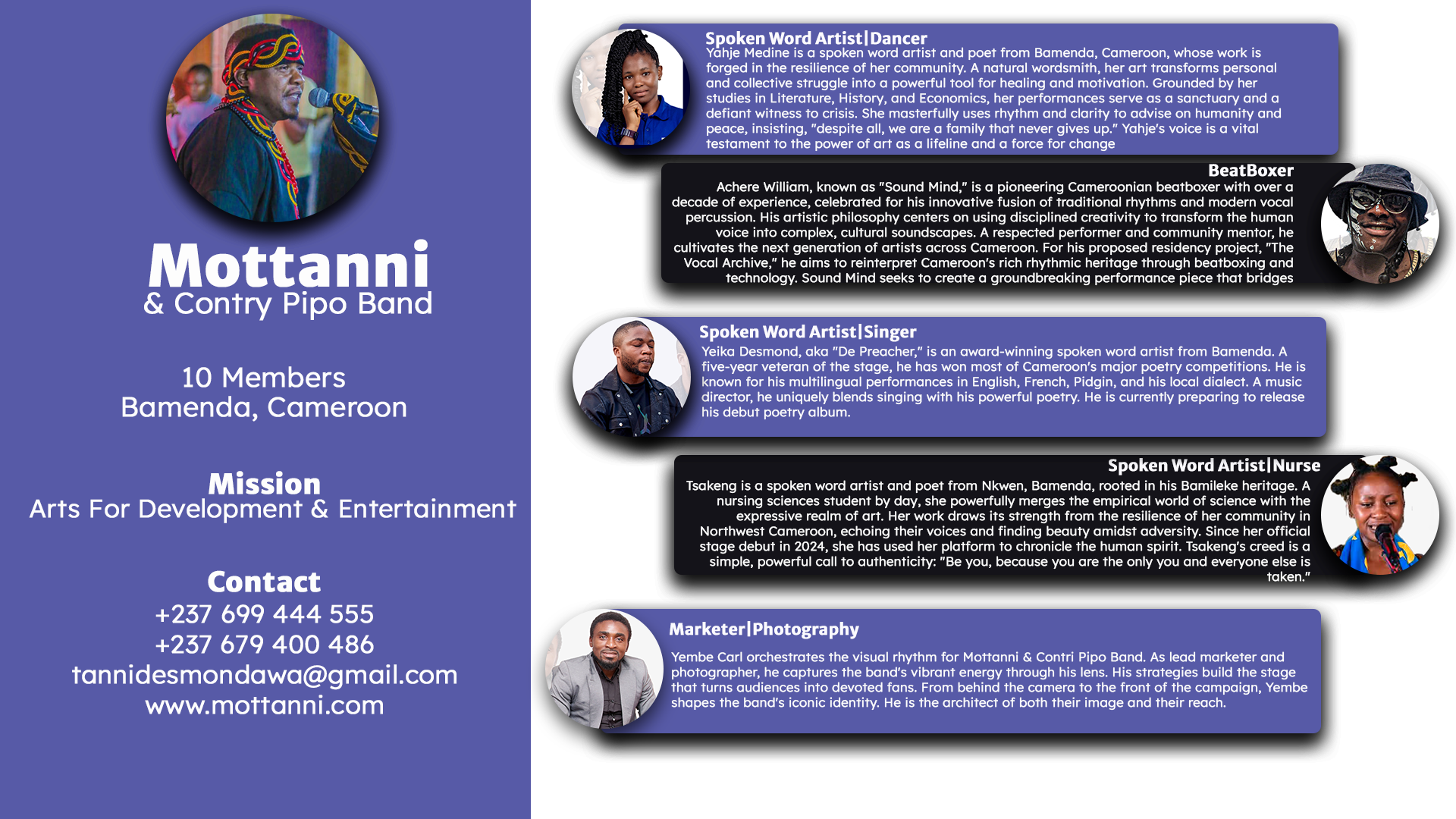 The Cameroonian Mottanni and Yi Kontri Pipo Band has taken up the mantle, transforming it into a modern engine for cultural preservation, social reflection, and community resilience. They are, in every sense, the voice of the "Kontri Pipo" – the country people – for a new generation.